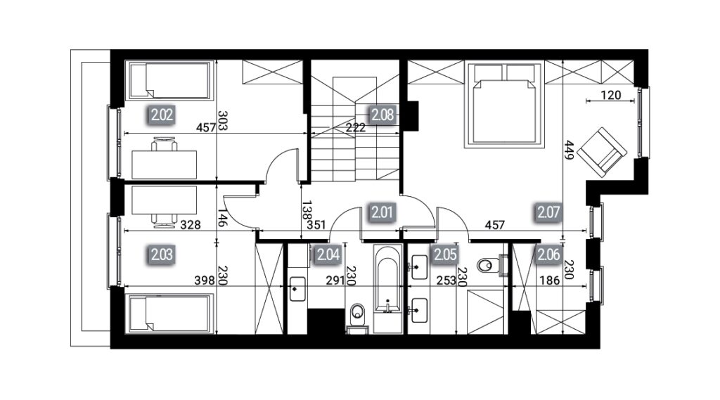 Budynek wyróżnia nowoczesna, bardzo estetyczna forma architektoniczna, dbałość o detale oraz wysoka klasa zastosowanych materiałów. Do Twojej dyspozycji jest również duży taras, na który wychodzi się przez olbrzymie okno w systemie HS, przyjemnie otwierające salon na ogród. Powierzchnia prywatnej działki do dowolnego zagospodarowania wynosi od 278 m² do 448 m².
