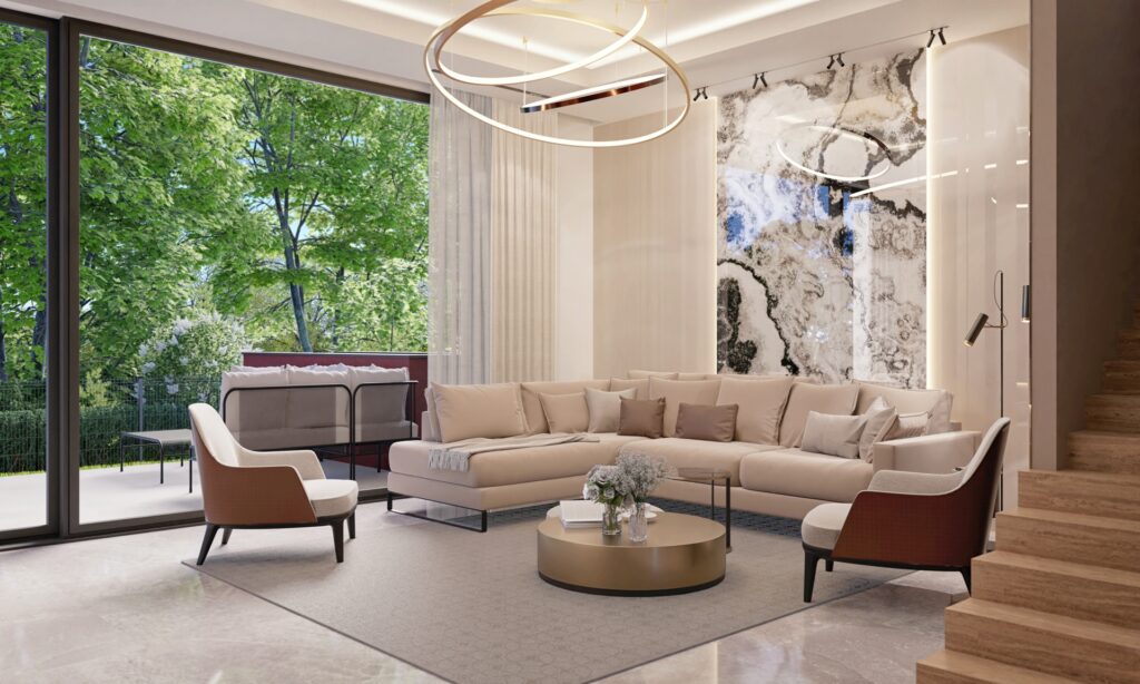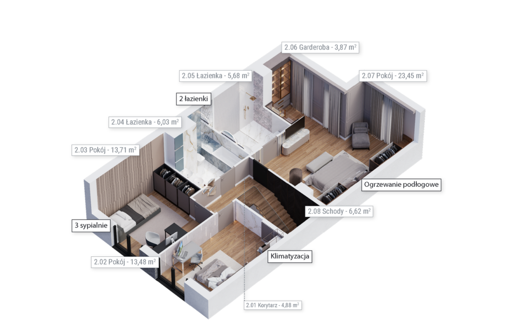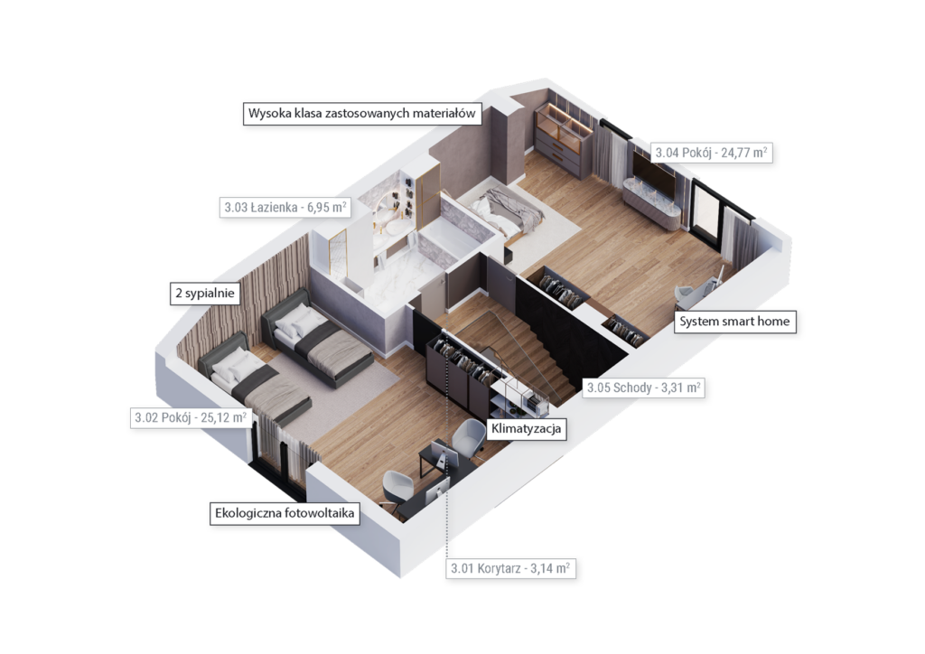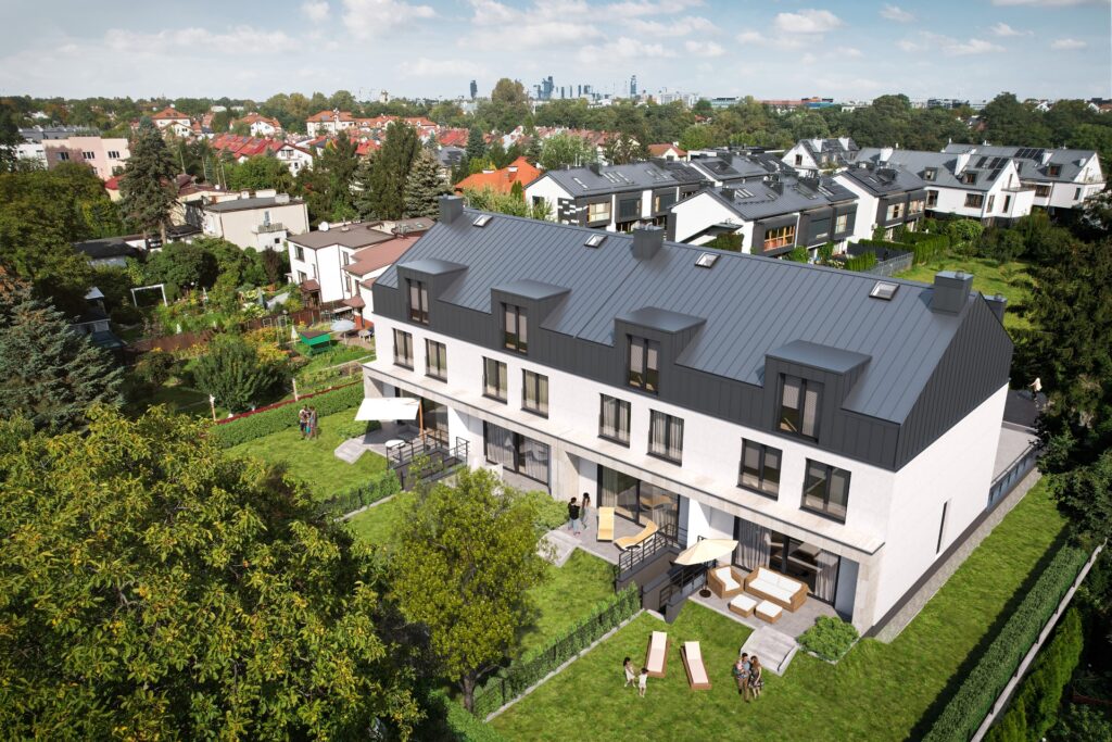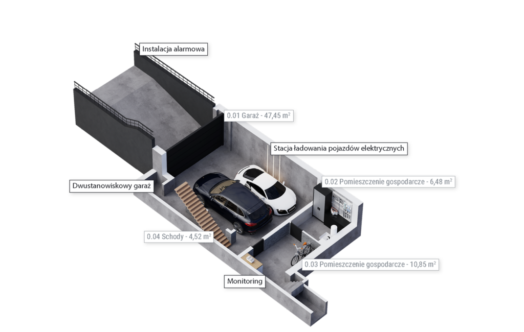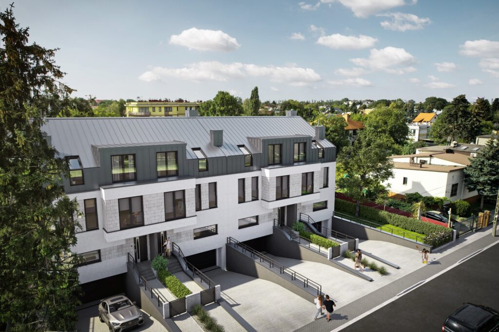 Zobacz dostępnośćDomy są niezwykle bogato wyposażone w standardzie deweloperskim premium – obejmuje on m.in. fotowoltaikę, klimatyzację, okna antywłamaniowe z roletami zewnętrznymi, system alarmowy, monitoring oraz stację ładowania pojazdów elektrycznych. Dostępny jest również system smart home, umożliwiający stacjonarne i zdalne sterowanie poszczególnymi funkcjami domu – oświetleniem, ogrzewaniem, wideodomofonem, alarmem, roletami zewnętrznymi czy też kamerami.Rozwiń ∨