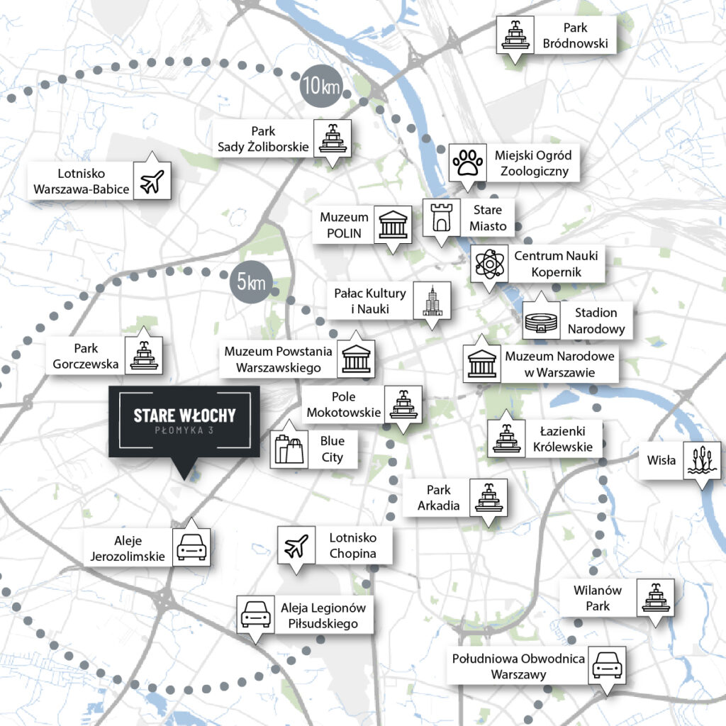 Inwestycja znajduje się przy ul. Płomyka 3 w Warszawie. To okolica, w której mieści się wszystko, czego potrzeba na co dzień do wygodnego życia – sklepy, punkty usługowe, tereny rekreacyjne, przedszkola, szkoły, przychodnie i wiele innych ważnych lokalizacji. Dużym atutem położenia domów jest również bliskość Alei Jerozolimskich, które zapewniają bardzo wygodny i szybki dojazd do ścisłego centrum miasta.Rozwiń ∨