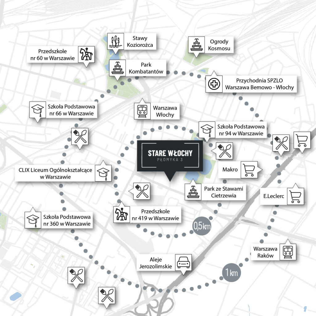 Idea angielskich miast-ogrodów została stworzona już w XIX wieku. Jej założeniem było połączenie zalet miasta (praca, rozrywka) i wsi (kontakt z naturą) na jednym obszarze. Podobne rozwiązania zastosowano w dzielnicy Włochy, w której znajdują się domy przy Płomyka 3. Miejsce to charakteryzuje się niską zabudową otoczoną zielenią. Jest bezpiecznie, spokojnie i cicho – możesz w komfortowych warunkach odpocząć po pracy.Rozwiń ∨